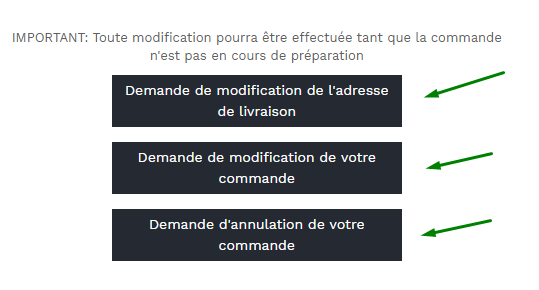Si vous avez besoin de modifier et/ou annuler un produit, une commande ou de changer votre adresse de livraison, il est indispensable de générer cette demande dans votre espace client, dans la section "Historiques commandes":