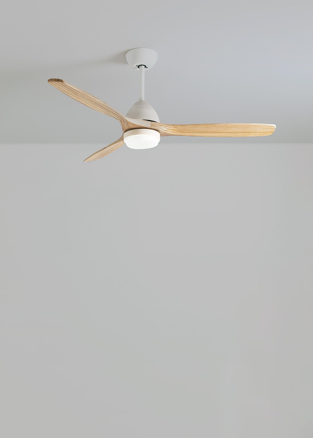 Ventilatore da soffitto silenzioso con motore DC 40 W, funzione estate-inverno e 6 velocità. Dispone di un timer programmabile in anticipo fino a 4 ore. È perfetto per ambienti fino a 28 m². Puoi scegliere tra l'opzione con luce LED a 3 temperature o l'opzione senza luce. Puoi anche scegliere il modello con wi-fi per controllarlo dal tuo telefono tramite l'app Create.