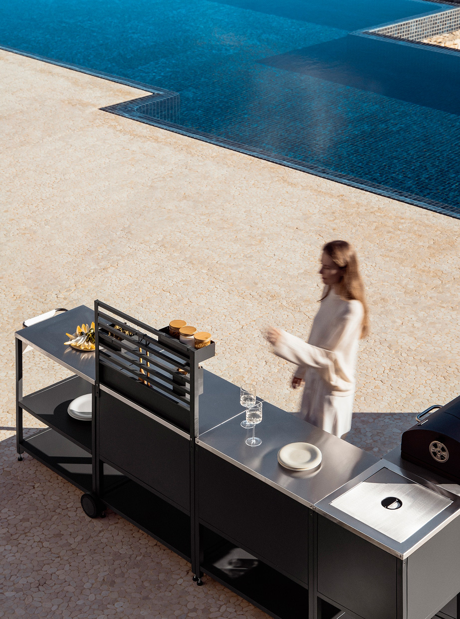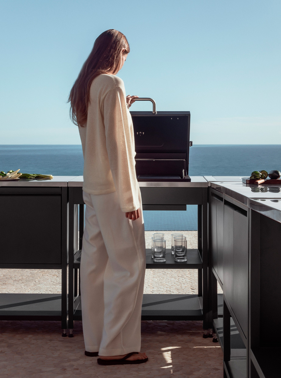 Konstrukcja ze stali nierdzewnej oraz modułowy system z grillami, miejscem do przechowywania i zlewem pozwalają stworzyć wszechstronną, trwałą kuchnię zewnętrzną dopasowaną do różnych stylów życia na świeżym powietrzu.